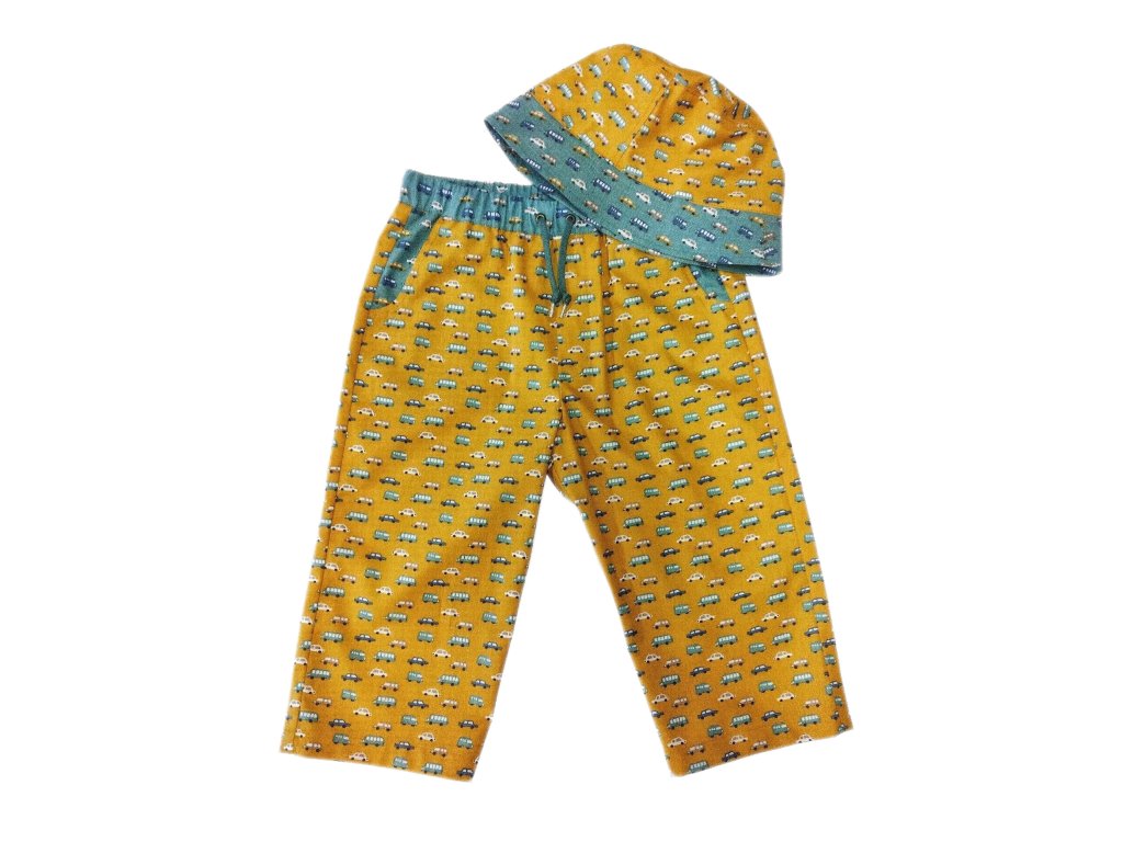 Dětské kalhoty a klobouk pro malé objevitele, co chtějí všechno vědět a vidět. Kalhoty mají dvě kapsy na schování důležitých drobností, jako trošku písku z pískoviště, kamínek z cesty, protože takový ještě nemá a třeba penízků na zmrzku, které dostane od babičky. Klobouk, jako módní doplněk a ochrana proti sluníčku kalhoty skvěle doplňuje.
