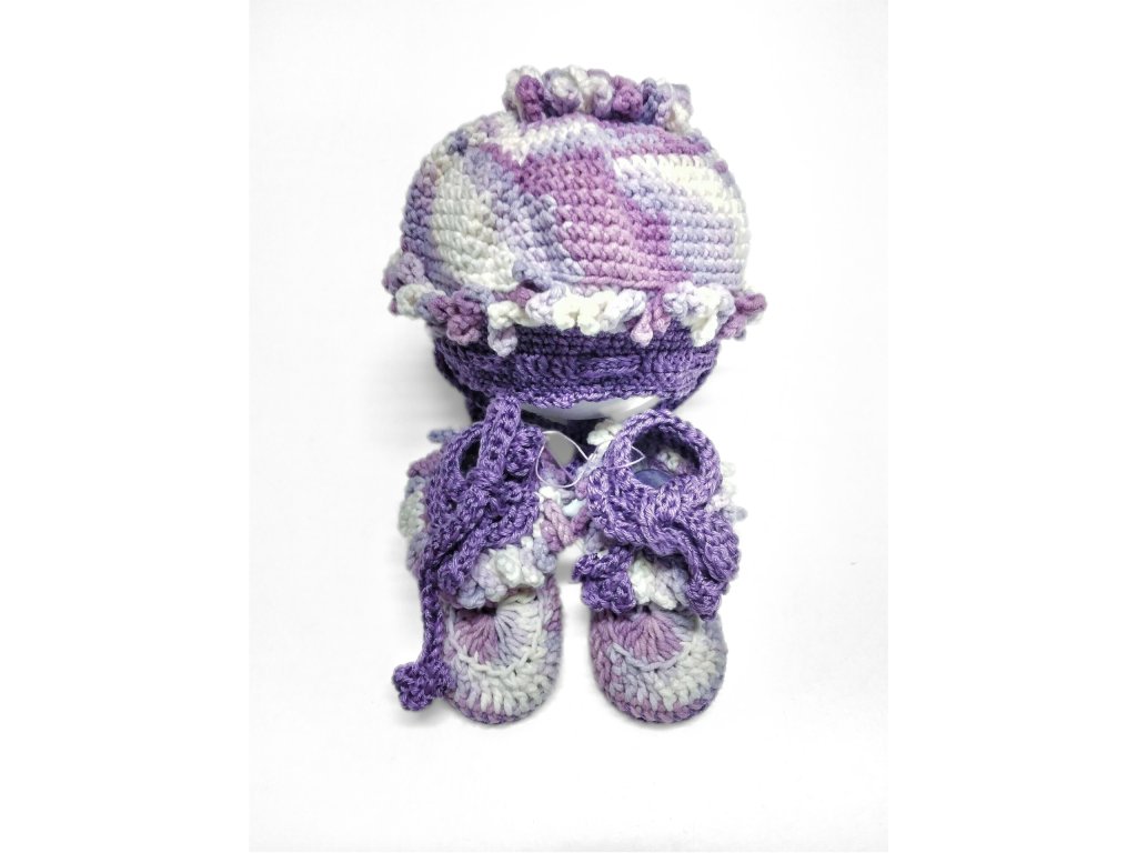 Tato kombinace baret a papučky byla vytvořená pro tradiční maminky, které chtějí své miminko obléci do pletených souprav. Fialová barva, jakožto neutrální barva se hodí, jak pro chlapečky, tak i pro holčičky. Navíc fialová barva symbolizuje lásku a něhu, takže Vaše miminko se v ní bude cítit hezky.
